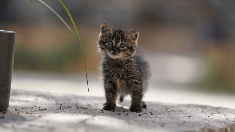 The motorcyclist walked over to the orange circle, which turned out to be a very small kitten curled in a ball. The kitten sat still, looking out into the distance, apparently unaware of how much danger they were in. When the kitten turned his head and looked at the rescuer, he was startled at first and appeared ready to bolt. But the motorcyclist moved forward slowly and reached.